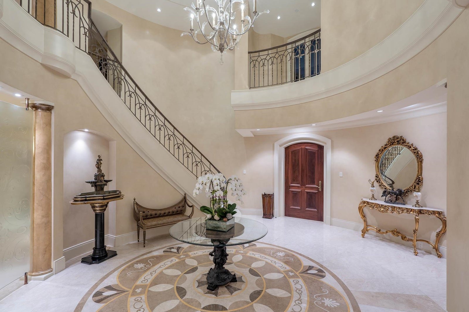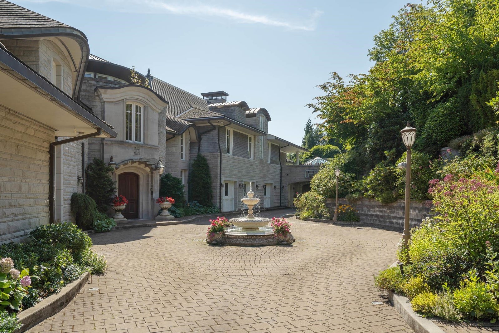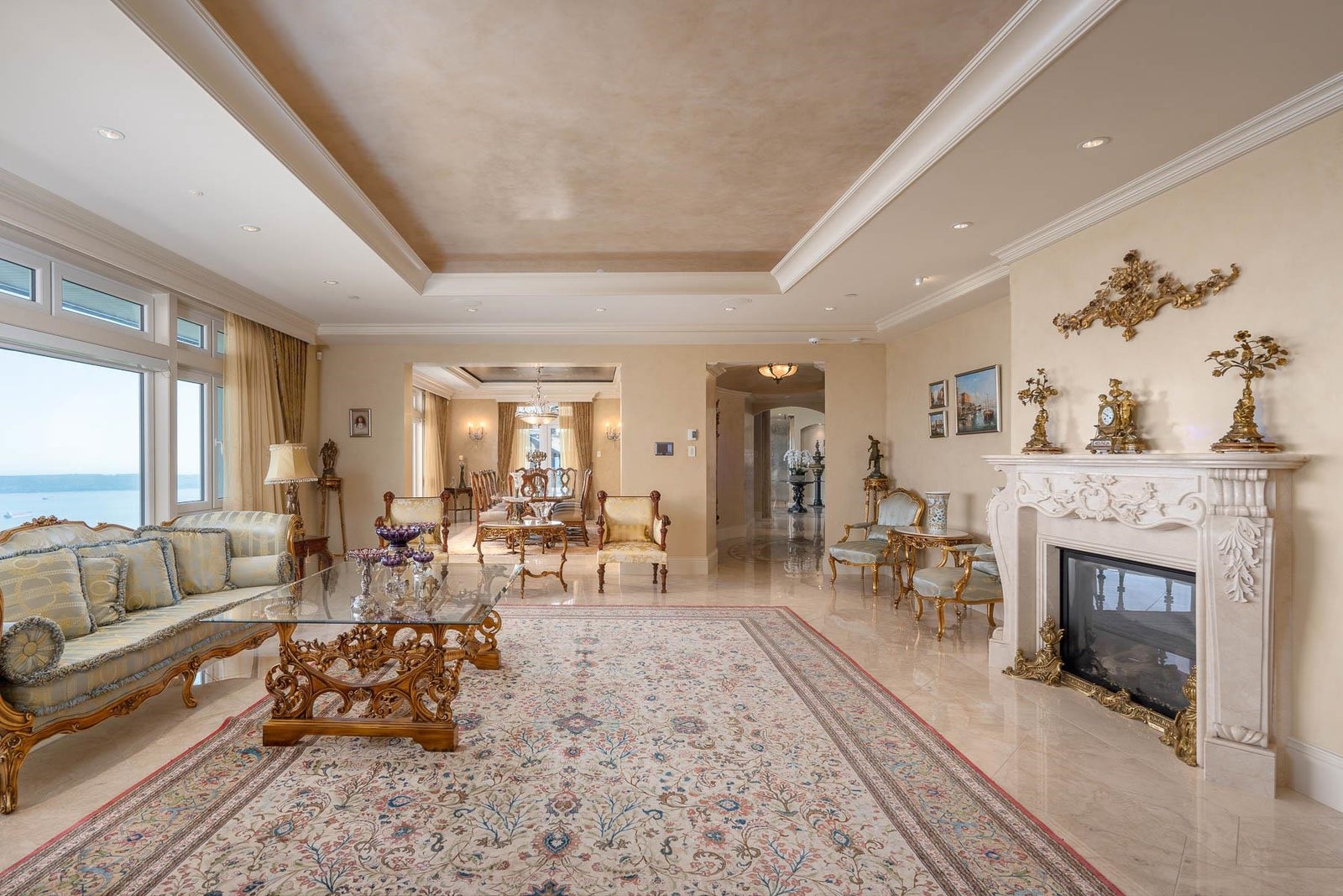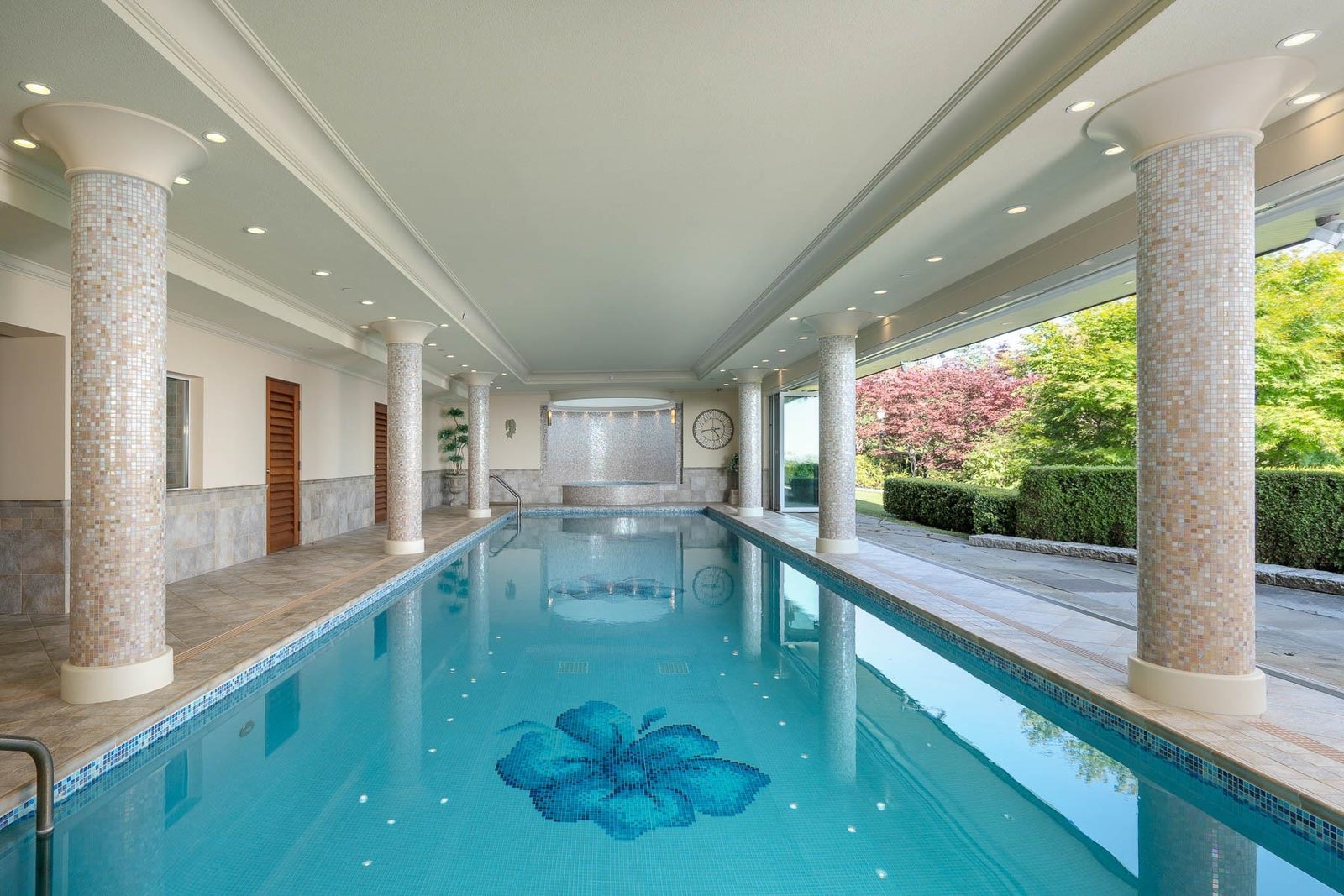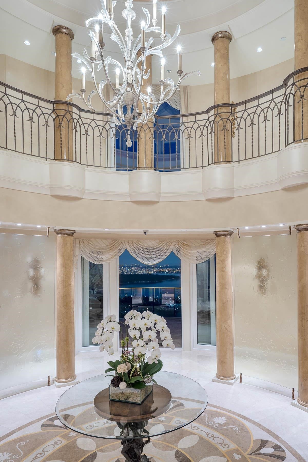 This 18,000 sq.ft. concrete masterpiece spans the entire corner block of prestigious Willoughby Road in West Vancouver. Designed by Paul Grant and built by Gordon Wilson, it sits on a flat, over-one-acre lot with a heated driveway and limestone exterior. Inside, marble medallions in the entrance and hallway, faux-finished walls, and hand-painted ceilings—including breathtaking ceiling art in the grand entrance and primary suite—create an ambiance of elevated luxury. A 45-ft indoor pool with folding glass doors is the centrepiece of spa-inspired amenities: hot tub, sauna, steam room, and cold plunge. Two service staircases lead to staff quarters and mechanical zones. A wok kitchen, expansive BBQ area, elevator, radiant heat, AC, 100% load generator, two guest suites, and a 6-car garage.