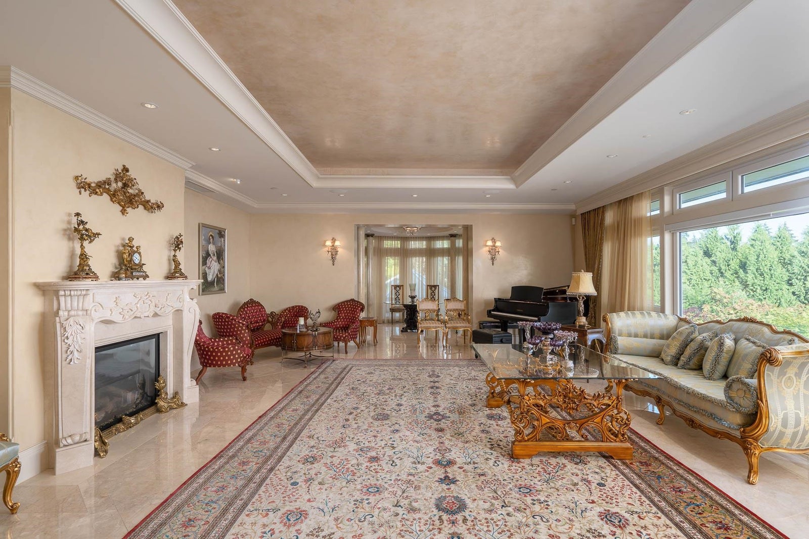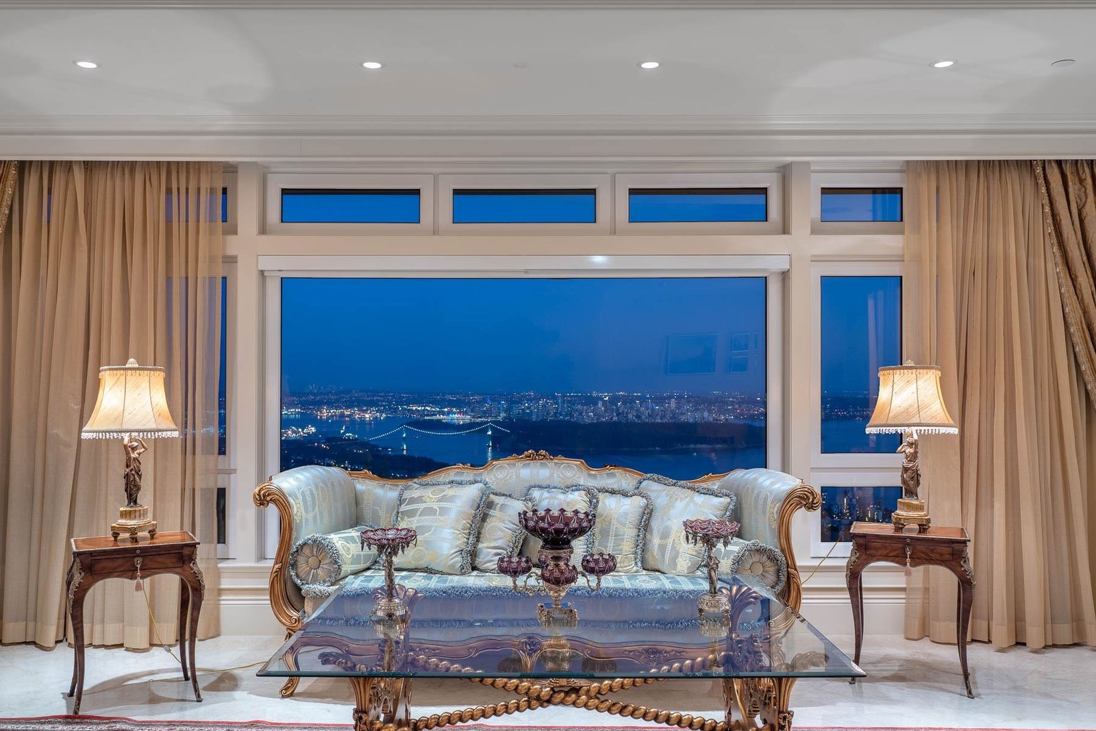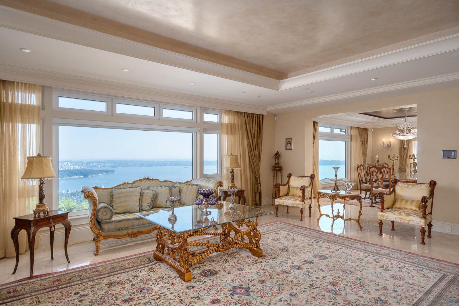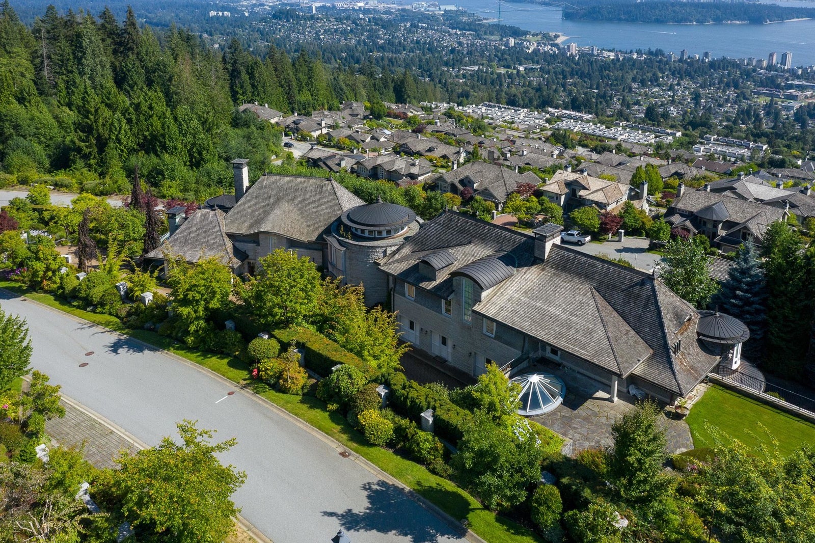 This 18,000 sq.ft. concrete masterpiece spans the entire corner block of prestigious Willoughby Road in West Vancouver. Designed by Paul Grant and built by Gordon Wilson, it sits on a flat, over-one-acre lot with a heated driveway and limestone exterior. Inside, marble medallions in the entrance and hallway, faux-finished walls, and hand-painted ceilings—including breathtaking ceiling art in the grand entrance and primary suite—create an ambiance of elevated luxury. A 45-ft indoor pool with folding glass doors is the centrepiece of spa-inspired amenities: hot tub, sauna, steam room, and cold plunge. Two service staircases lead to staff quarters and mechanical zones. A wok kitchen, expansive BBQ area, elevator, radiant heat, AC, 100% load generator, two guest suites, and a 6-car garage.