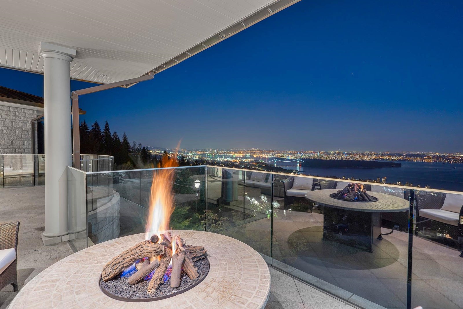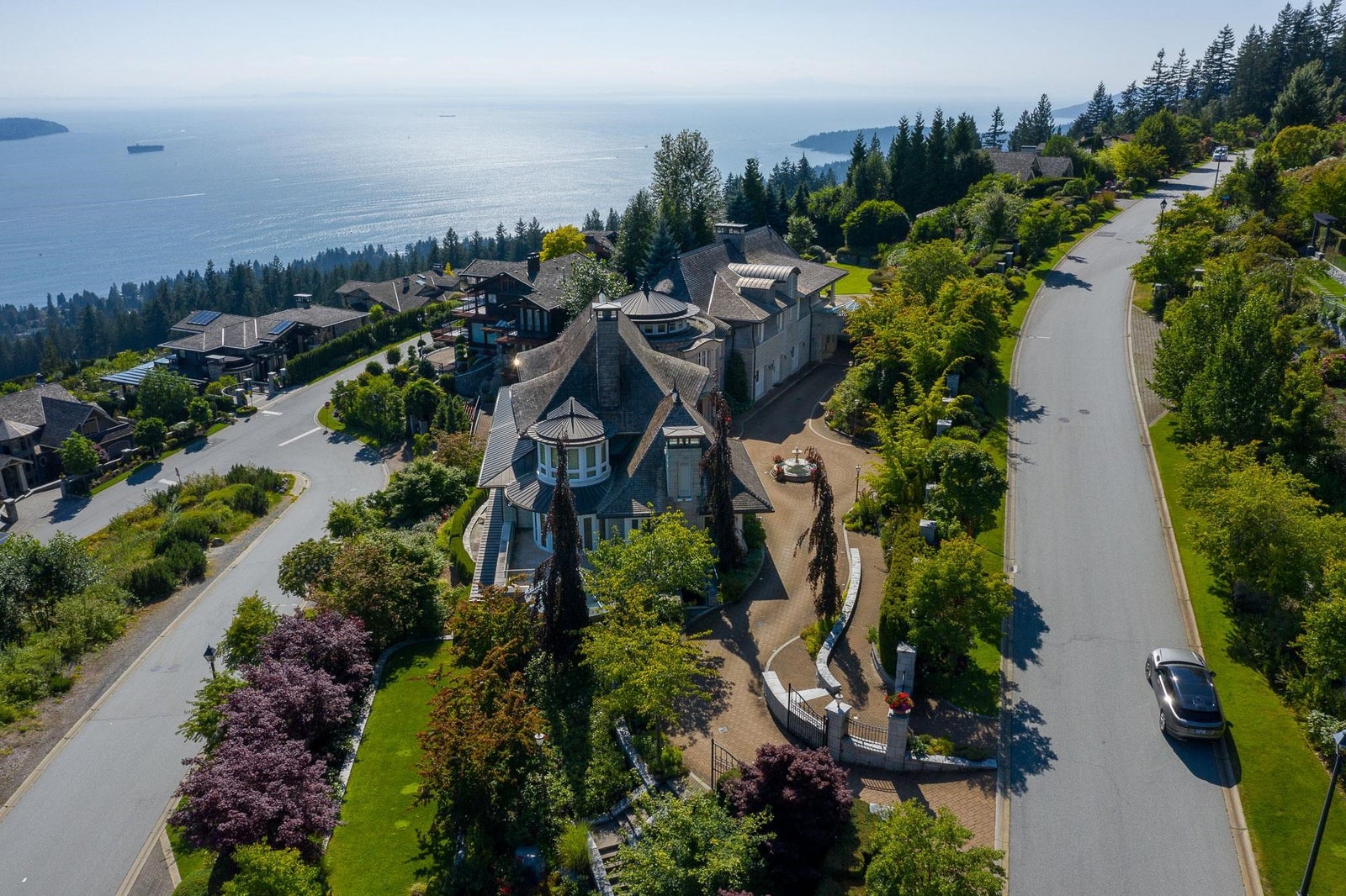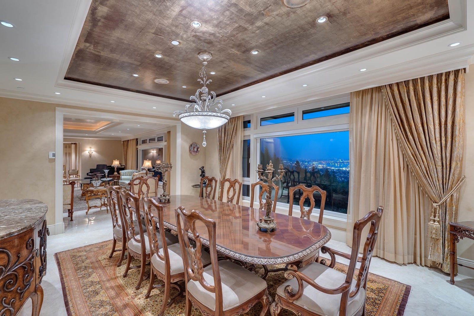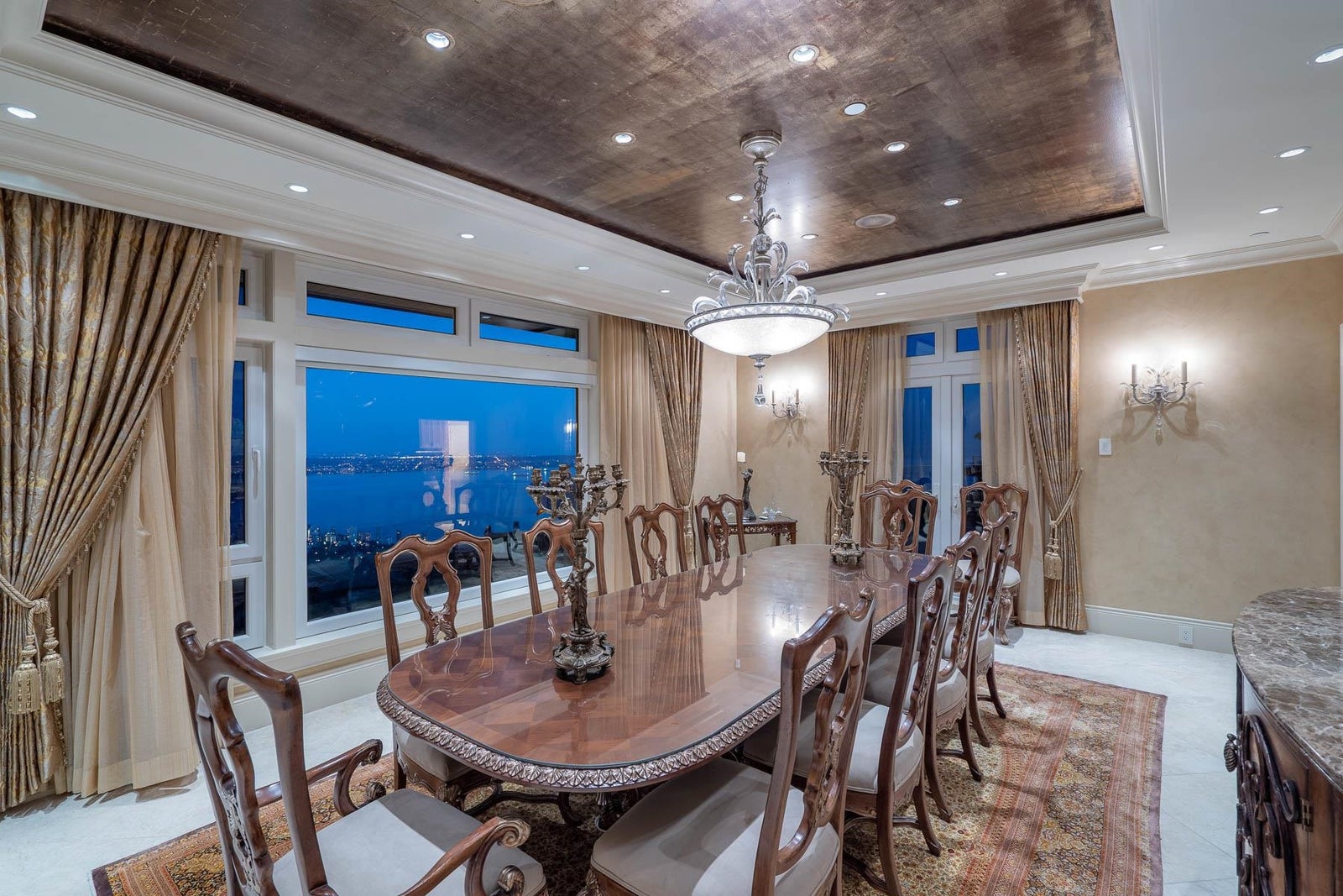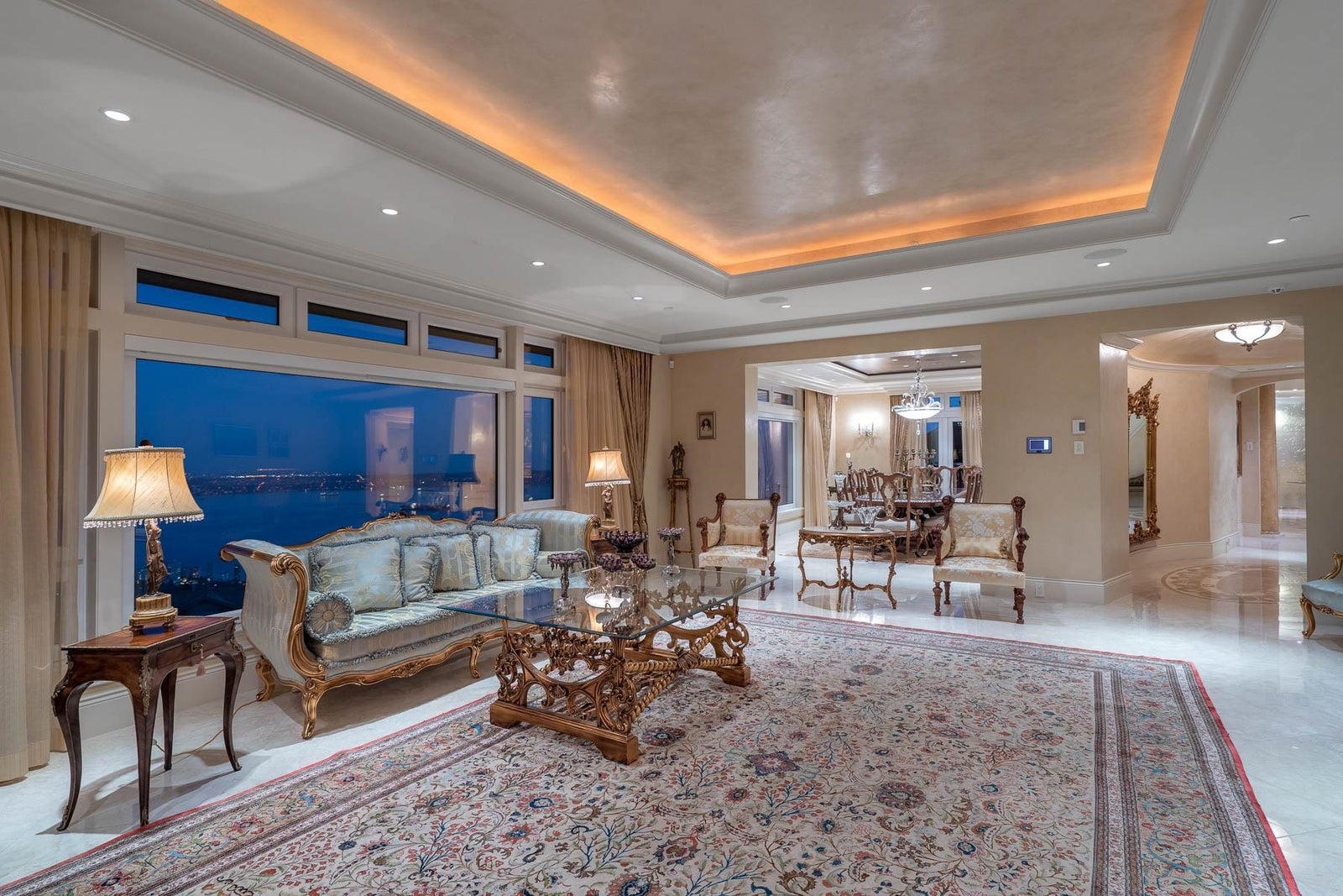 This 18,000 sq.ft. concrete masterpiece spans the entire corner block of prestigious Willoughby Road in West Vancouver. Designed by Paul Grant and built by Gordon Wilson, it sits on a flat, over-one-acre lot with a heated driveway and limestone exterior. Inside, marble medallions in the entrance and hallway, faux-finished walls, and hand-painted ceilings—including breathtaking ceiling art in the grand entrance and primary suite—create an ambiance of elevated luxury. A 45-ft indoor pool with folding glass doors is the centrepiece of spa-inspired amenities: hot tub, sauna, steam room, and cold plunge. Two service staircases lead to staff quarters and mechanical zones. A wok kitchen, expansive BBQ area, elevator, radiant heat, AC, 100% load generator, two guest suites, and a 6-car garage.