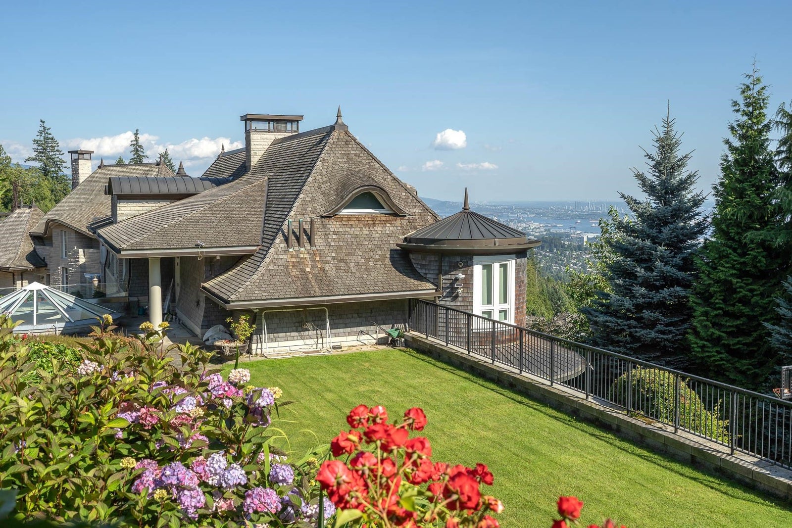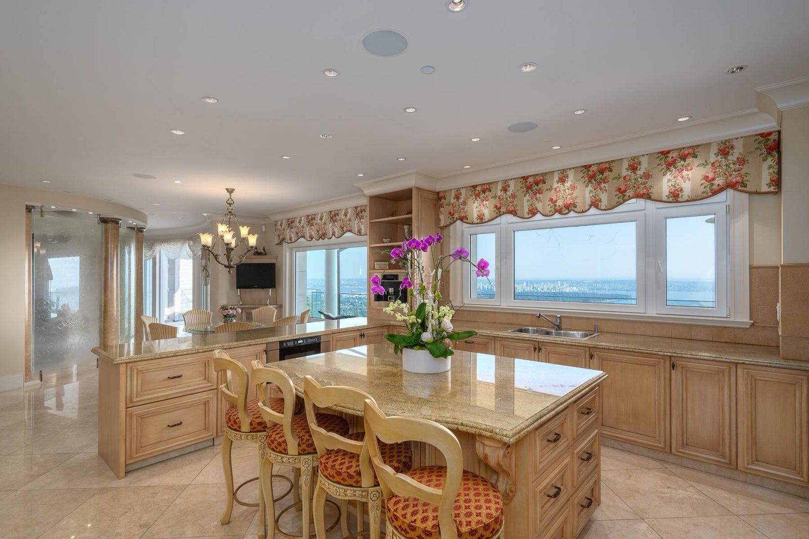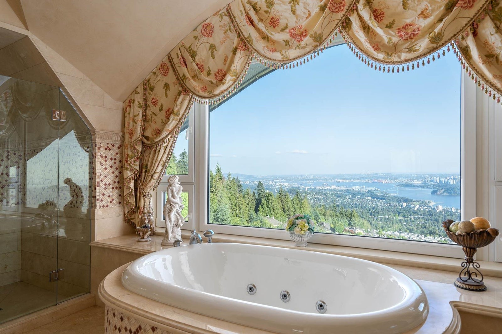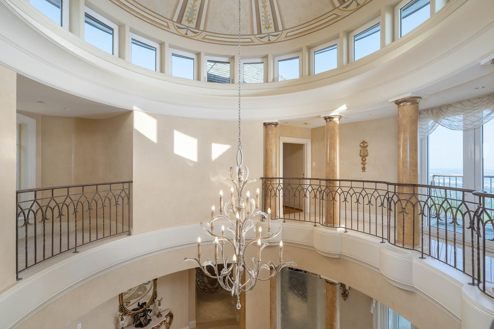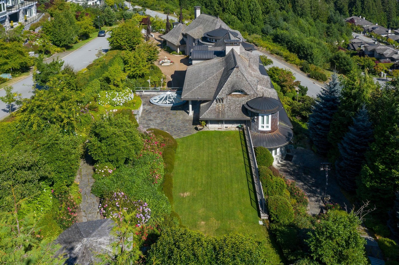 This 18,000 sq.ft. concrete masterpiece spans the entire corner block of prestigious Willoughby Road in West Vancouver. Designed by Paul Grant and built by Gordon Wilson, it sits on a flat, over-one-acre lot with a heated driveway and limestone exterior. Inside, marble medallions in the entrance and hallway, faux-finished walls, and hand-painted ceilings—including breathtaking ceiling art in the grand entrance and primary suite—create an ambiance of elevated luxury. A 45-ft indoor pool with folding glass doors is the centrepiece of spa-inspired amenities: hot tub, sauna, steam room, and cold plunge. Two service staircases lead to staff quarters and mechanical zones. A wok kitchen, expansive BBQ area, elevator, radiant heat, AC, 100% load generator, two guest suites, and a 6-car garage.