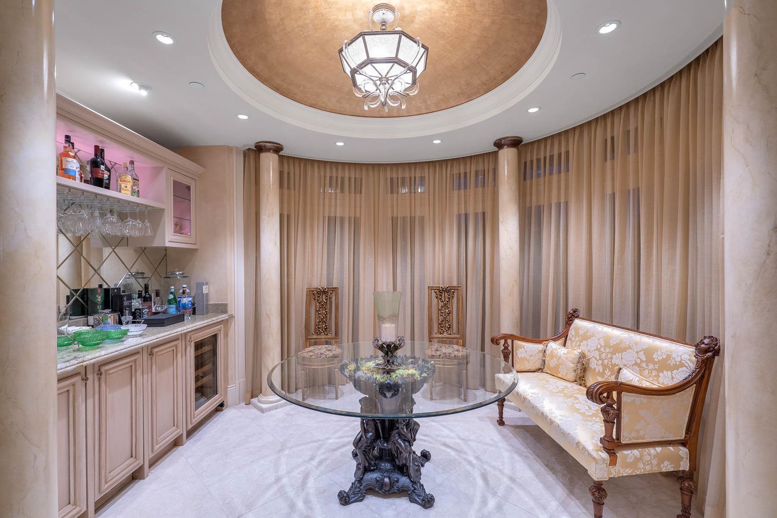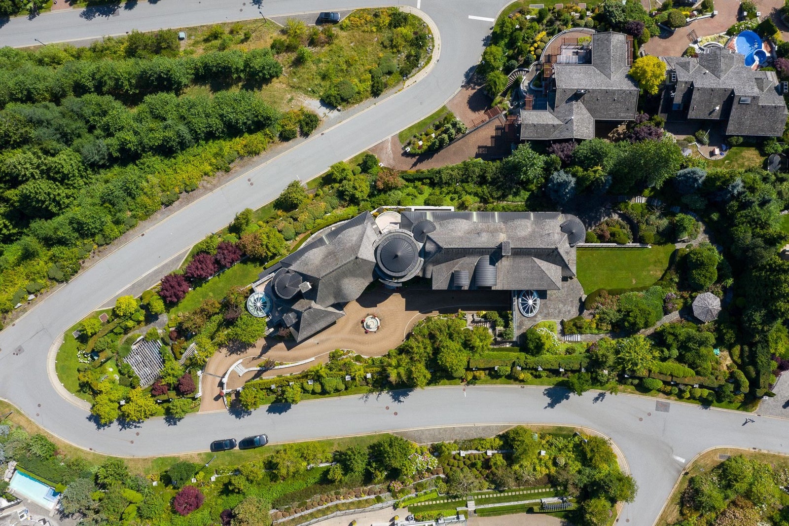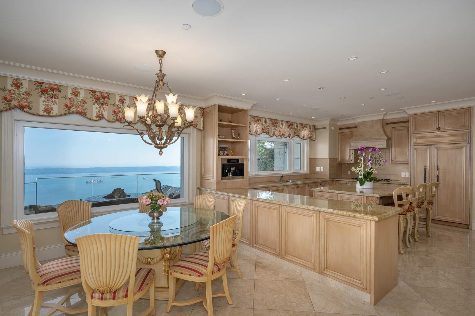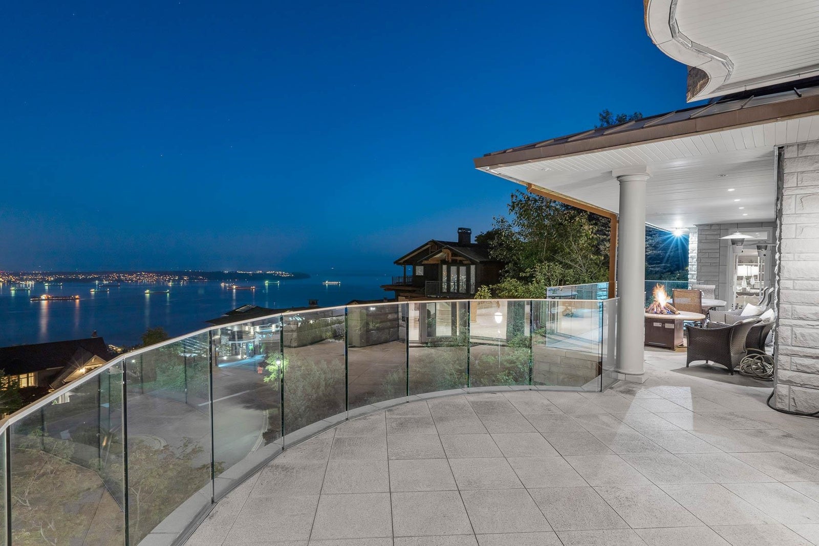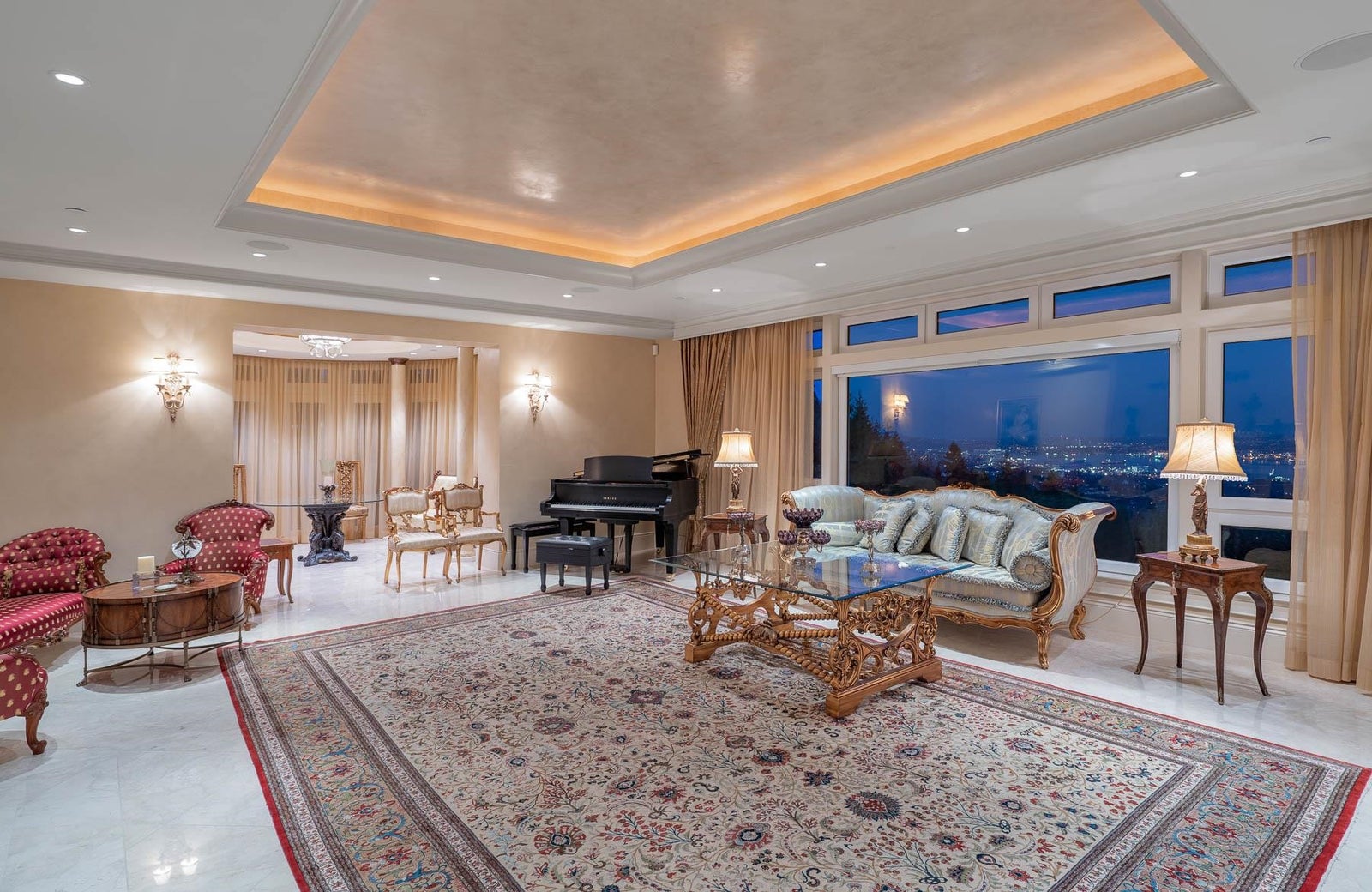 This 18,000 sq.ft. concrete masterpiece spans the entire corner block of prestigious Willoughby Road in West Vancouver. Designed by Paul Grant and built by Gordon Wilson, it sits on a flat, over-one-acre lot with a heated driveway and limestone exterior. Inside, marble medallions in the entrance and hallway, faux-finished walls, and hand-painted ceilings—including breathtaking ceiling art in the grand entrance and primary suite—create an ambiance of elevated luxury. A 45-ft indoor pool with folding glass doors is the centrepiece of spa-inspired amenities: hot tub, sauna, steam room, and cold plunge. Two service staircases lead to staff quarters and mechanical zones. A wok kitchen, expansive BBQ area, elevator, radiant heat, AC, 100% load generator, two guest suites, and a 6-car garage.