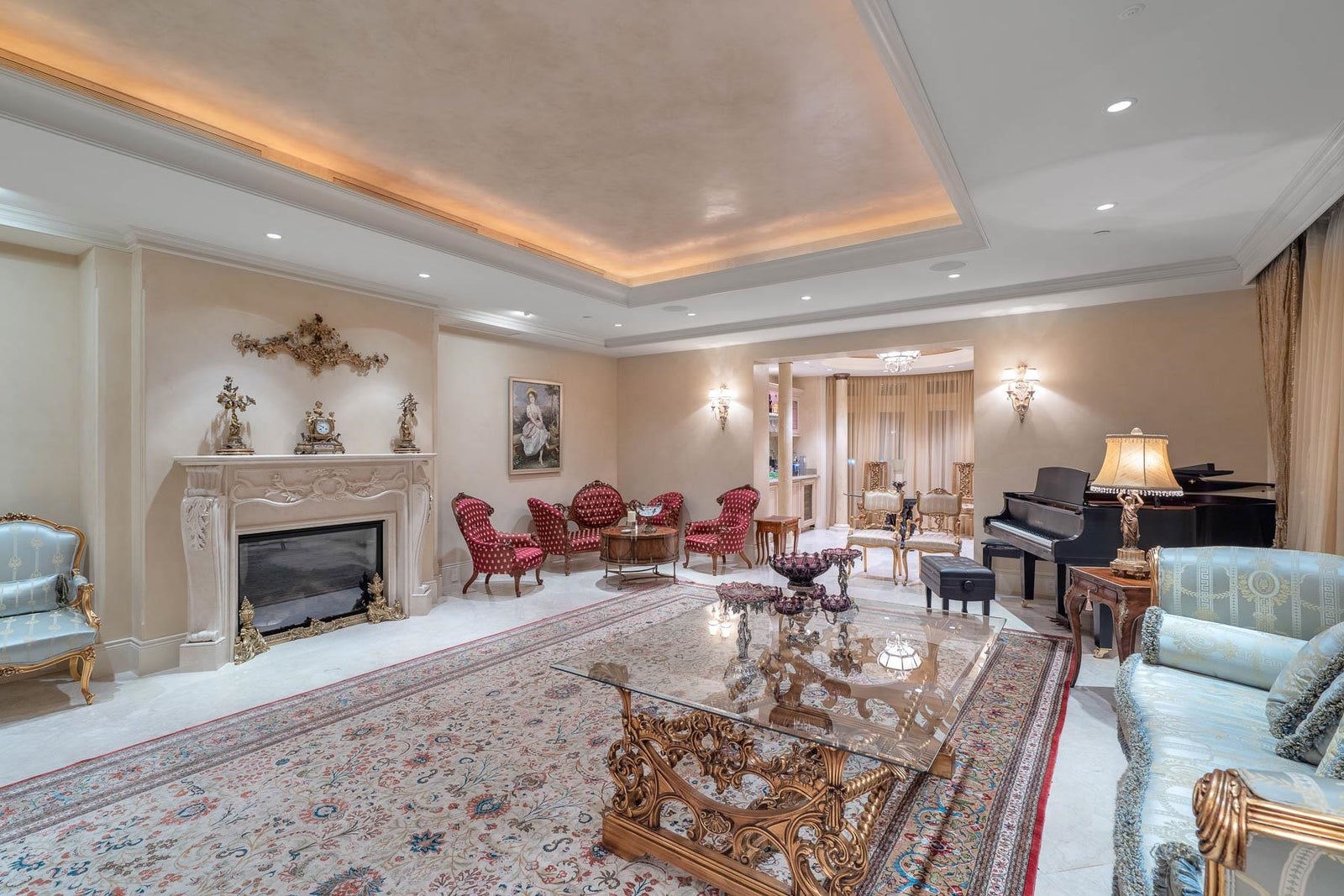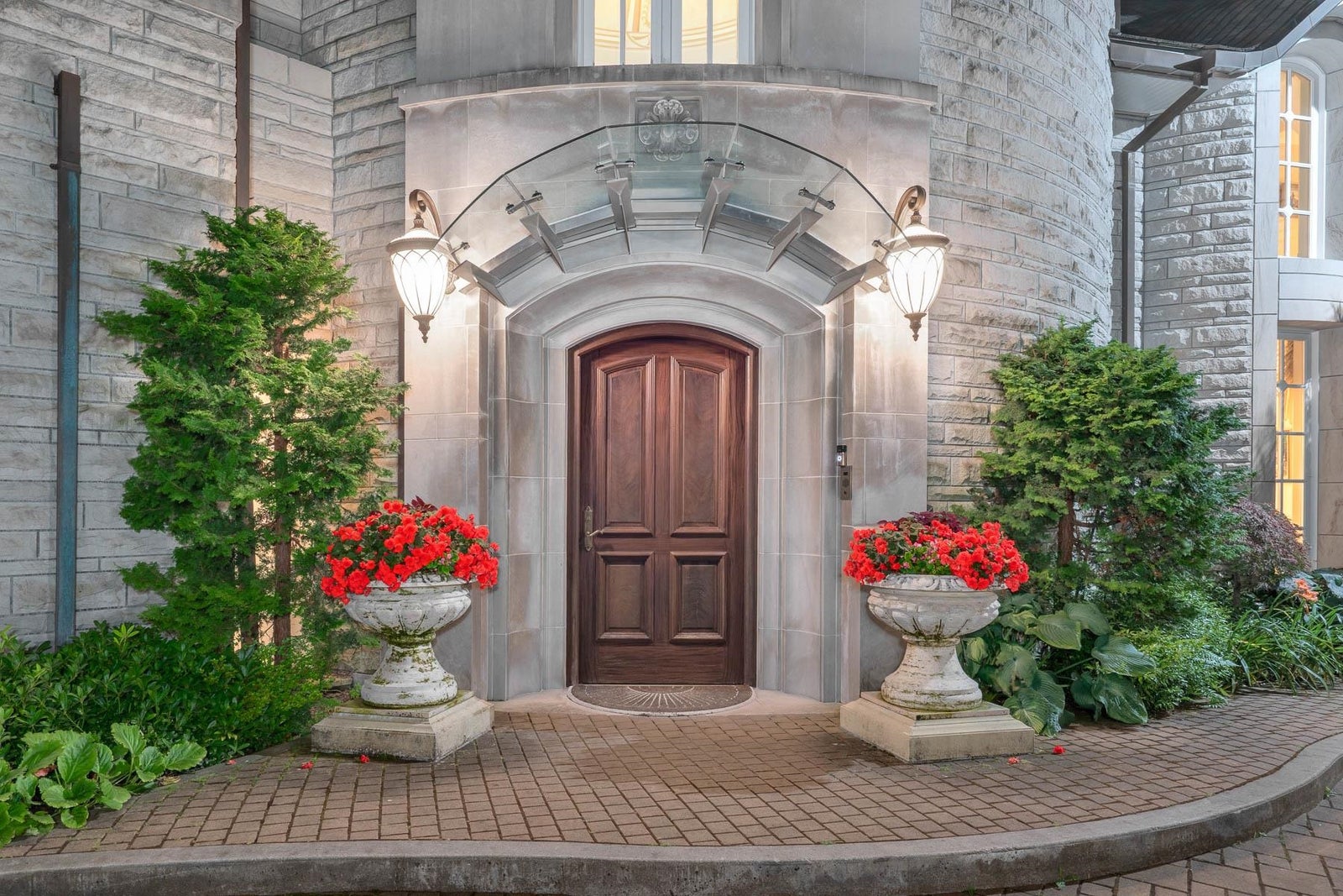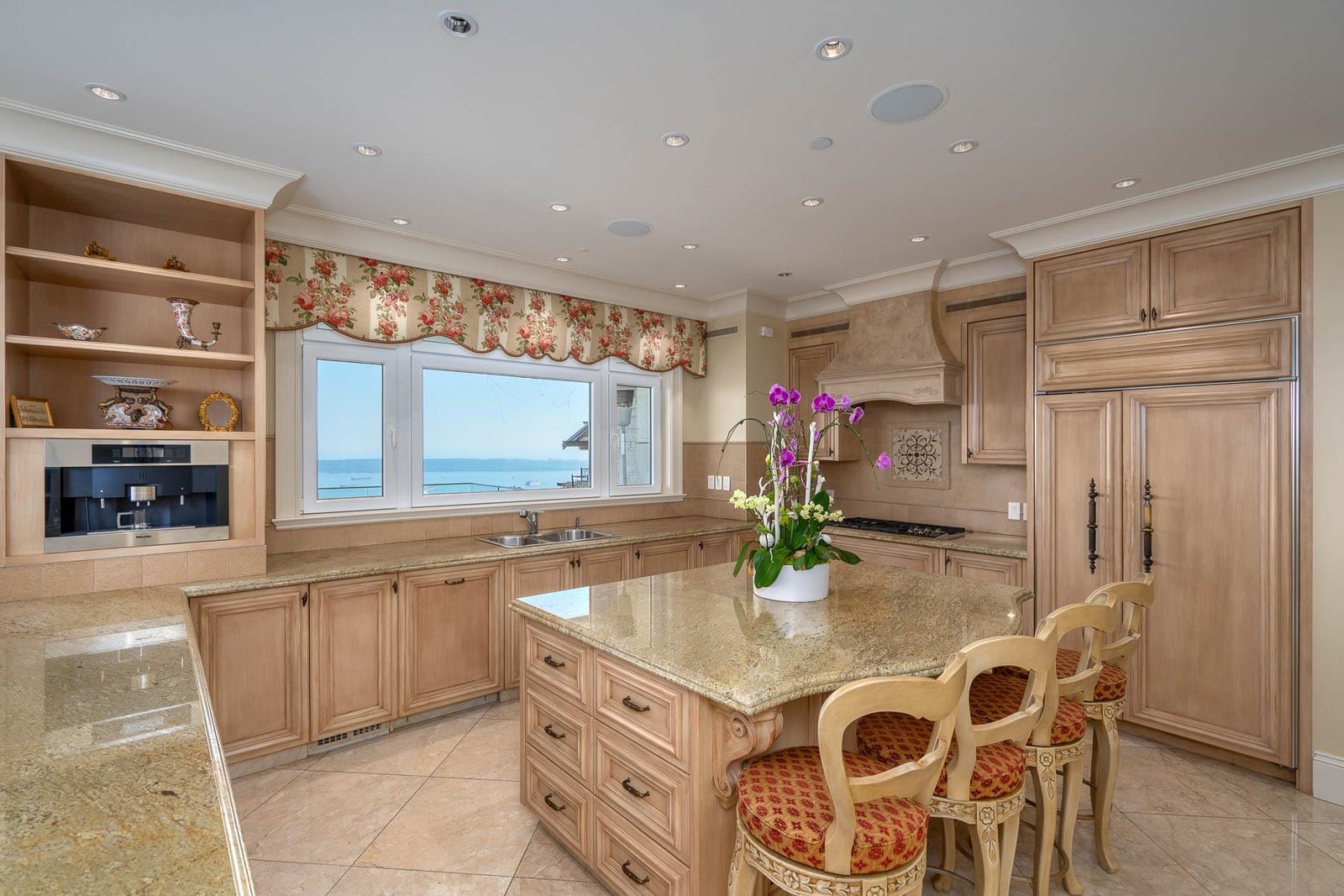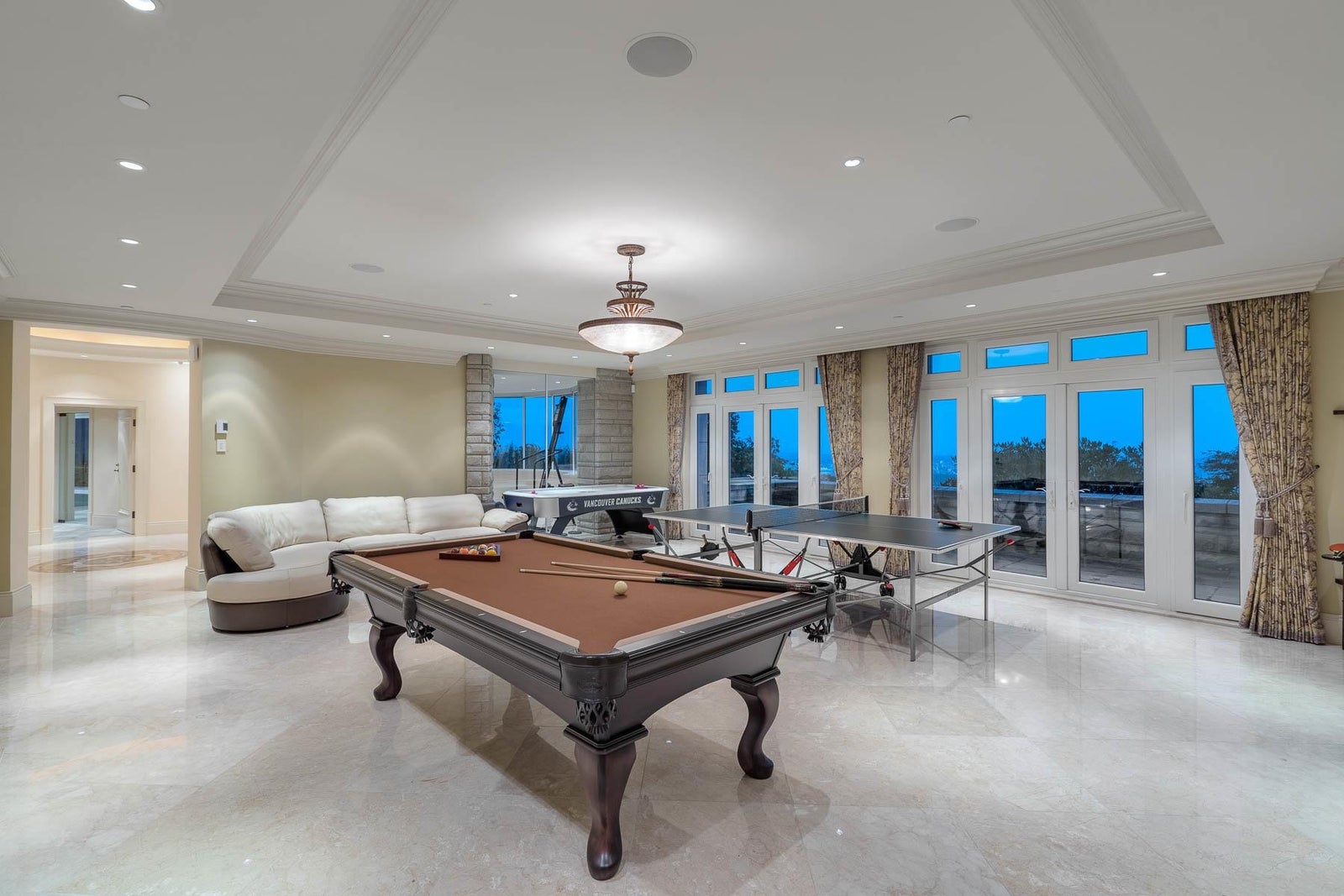 This 18,000 sq.ft. concrete masterpiece spans the entire corner block of prestigious Willoughby Road in West Vancouver. Designed by Paul Grant and built by Gordon Wilson, it sits on a flat, over-one-acre lot with a heated driveway and limestone exterior. Inside, marble medallions in the entrance and hallway, faux-finished walls, and hand-painted ceilings—including breathtaking ceiling art in the grand entrance and primary suite—create an ambiance of elevated luxury. A 45-ft indoor pool with folding glass doors is the centrepiece of spa-inspired amenities: hot tub, sauna, steam room, and cold plunge. Two service staircases lead to staff quarters and mechanical zones. A wok kitchen, expansive BBQ area, elevator, radiant heat, AC, 100% load generator, two guest suites, and a 6-car garage.