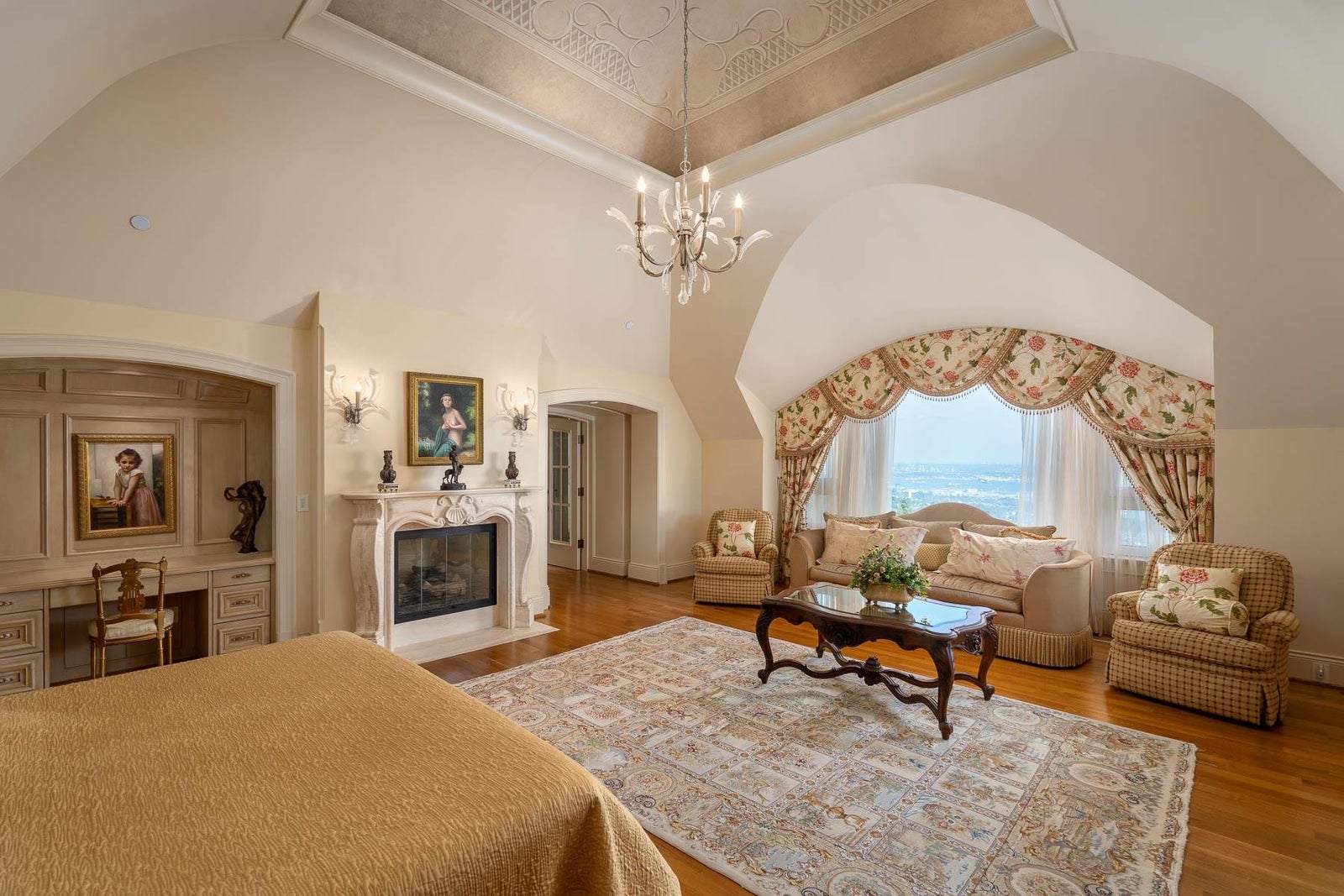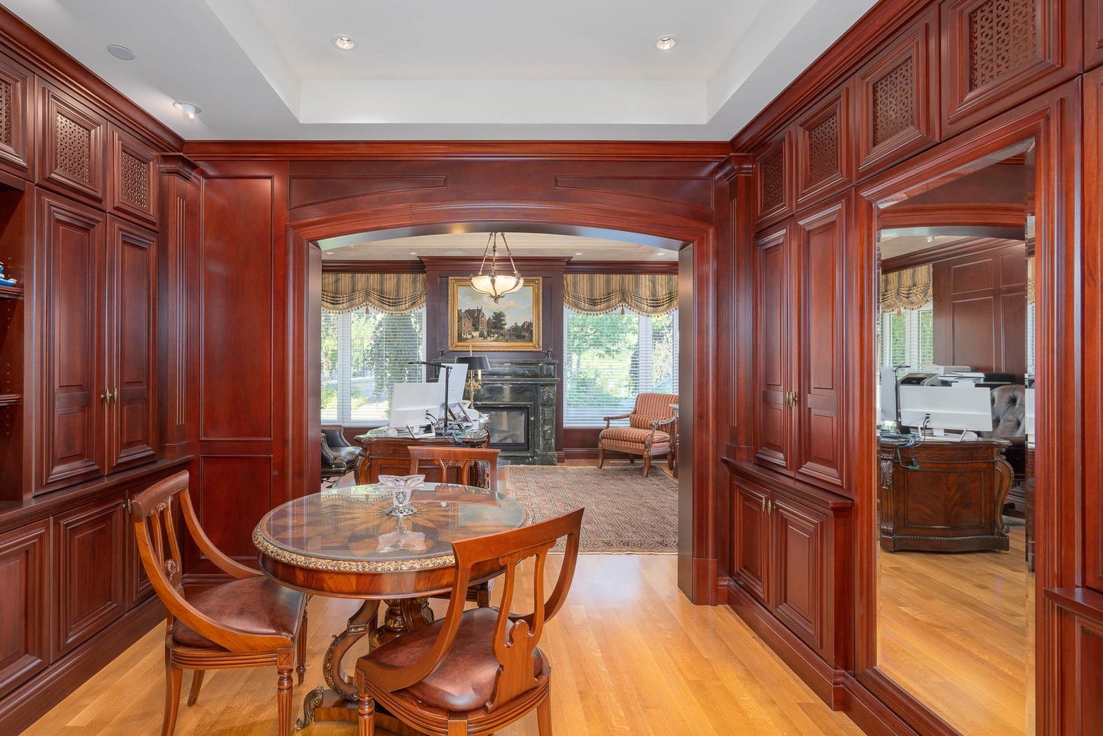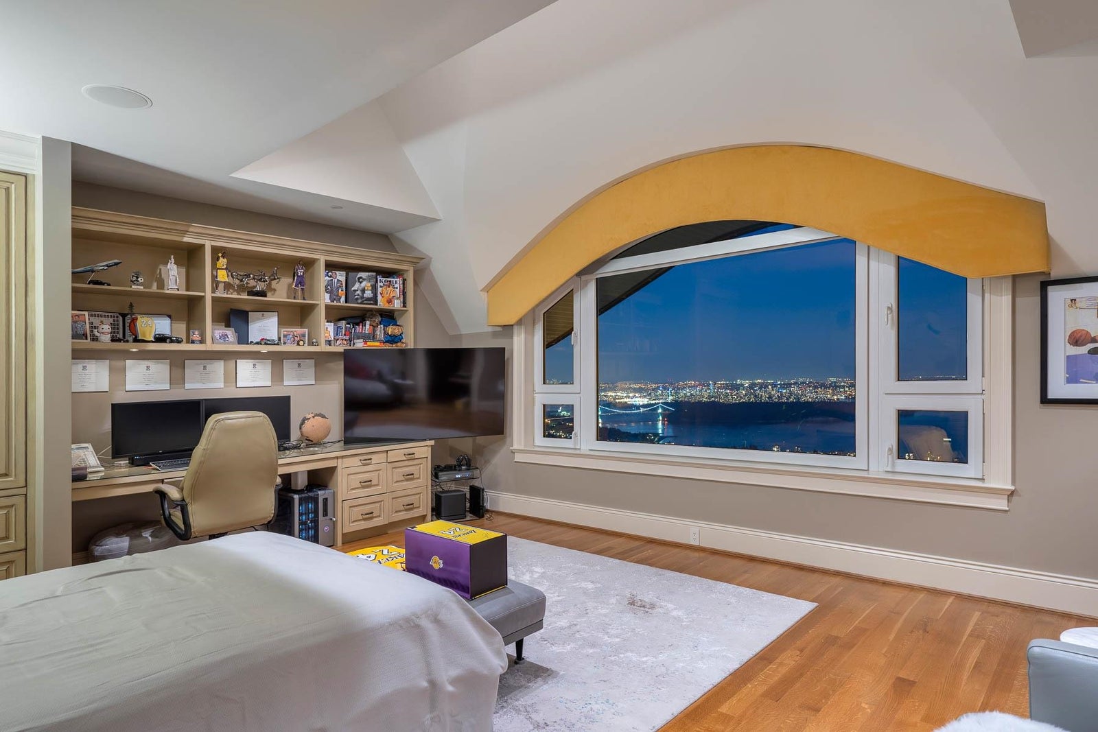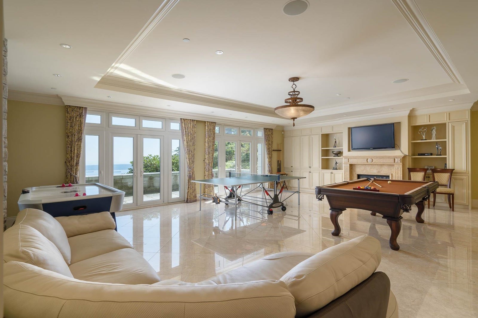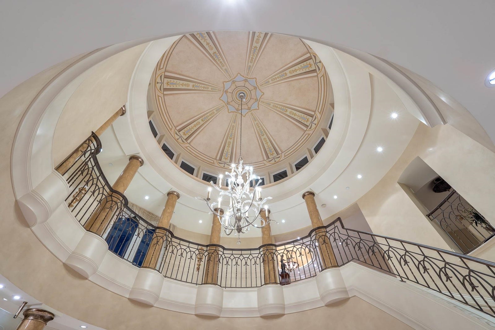 This 18,000 sq.ft. concrete masterpiece spans the entire corner block of prestigious Willoughby Road in West Vancouver. Designed by Paul Grant and built by Gordon Wilson, it sits on a flat, over-one-acre lot with a heated driveway and limestone exterior. Inside, marble medallions in the entrance and hallway, faux-finished walls, and hand-painted ceilings—including breathtaking ceiling art in the grand entrance and primary suite—create an ambiance of elevated luxury. A 45-ft indoor pool with folding glass doors is the centrepiece of spa-inspired amenities: hot tub, sauna, steam room, and cold plunge. Two service staircases lead to staff quarters and mechanical zones. A wok kitchen, expansive BBQ area, elevator, radiant heat, AC, 100% load generator, two guest suites, and a 6-car garage.